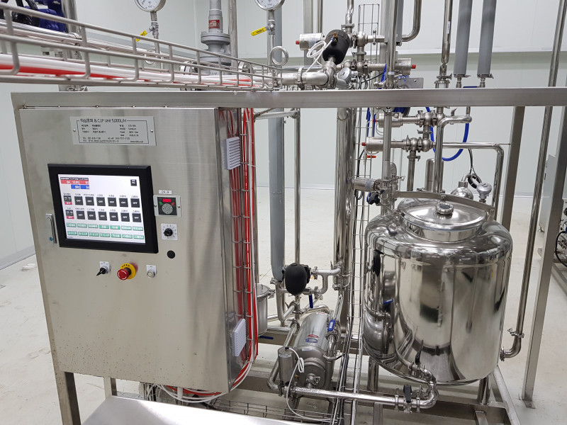 음성 대원테크에 납품중인 사진이며 CAPACITY- 2,000리터/hr 100도 까지 열처리 능력이 있으며 자체 C.I.P 구조로 설계되어 효율적인 제품 생산을 유도 합니다.